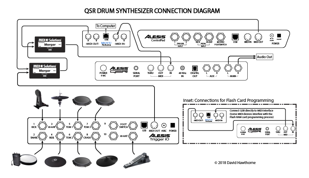 For example, you can combine a pad controller, like the Alesis Control Pad, with other types of triggers connected through a trigger interface like the Alesis Trigger iO. You can also connect multiple QSR synthesizers to your MIDI controllers with proper attention to MIDI channel assignments.