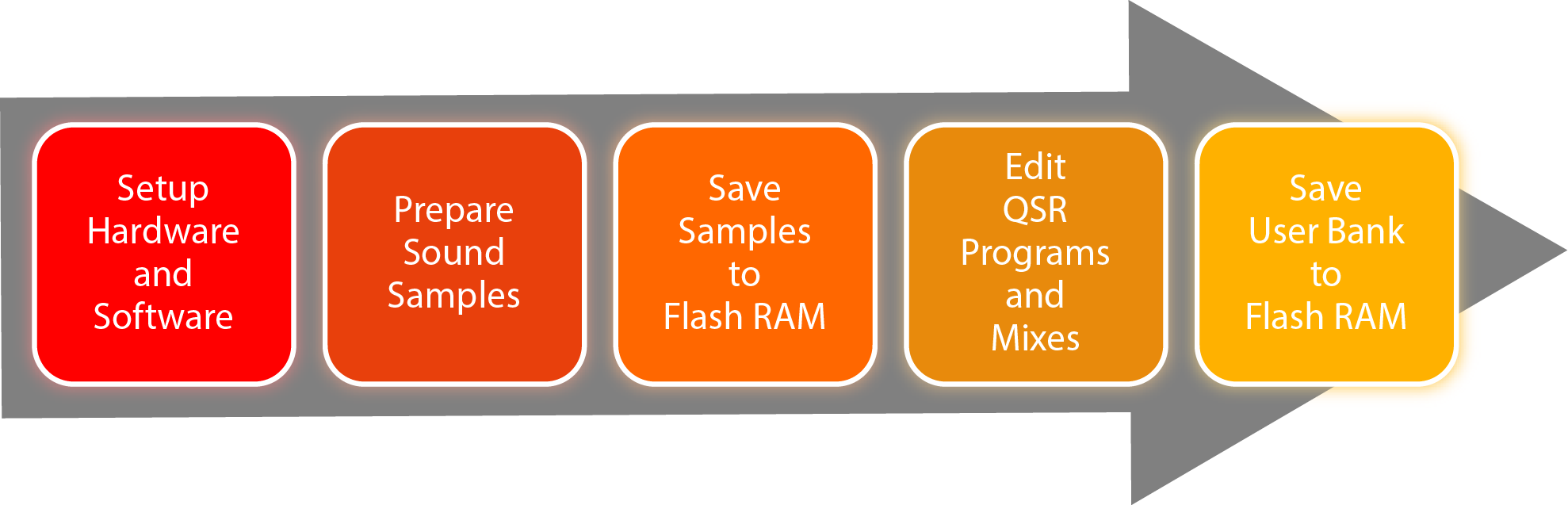 Programming the QSR Drum Synthesizer requires a phased approach that includes setup, backup, sample preparation, sample upload, creation of Programs and Mixes, and transfer to the Flash RAM card.