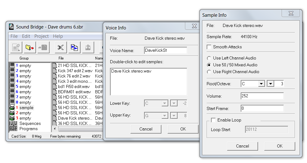 Auto-split stereo files is a check box that tells Sound Bridge how to work with stereo files. It is unchecked by default. Check this box if you want Sound Bridge to split the stereo sample file into two mono sample files. If the box is checked before a stereo sample is loaded the letter L will be attached to the left channel file name, the letter R to the other, and both will be saved to the Project. If the box is unchecked when the file is opened, Sound Bridge will save it as a single, mono file. Conversion from stereo to mono occurs during processing prior to transmitting the Project to the QSR.
