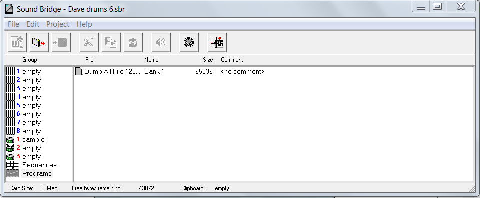 A Project is any collection of instruments, samples, Programs, Mixes, and sequences that you choose to organize using Sound Bridge. Sound Bridge offers a high degree of flexibility, in terms of how data is organized for use in the QSR. Many of the features in Sound Bridge are designed for keyboard synthesizers and do not apply in this context. This procedure describes features and procedures relevant to programming the QSR Drum Synthesizer.