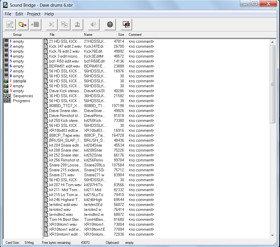 Typical drum synthesizer Projects will use most of the available storage space for sample files. A SYSEX file will be included in the Project, containing the Programs, Mixes, and Effects that will be transferred to the User bank from the Flash RAM card.